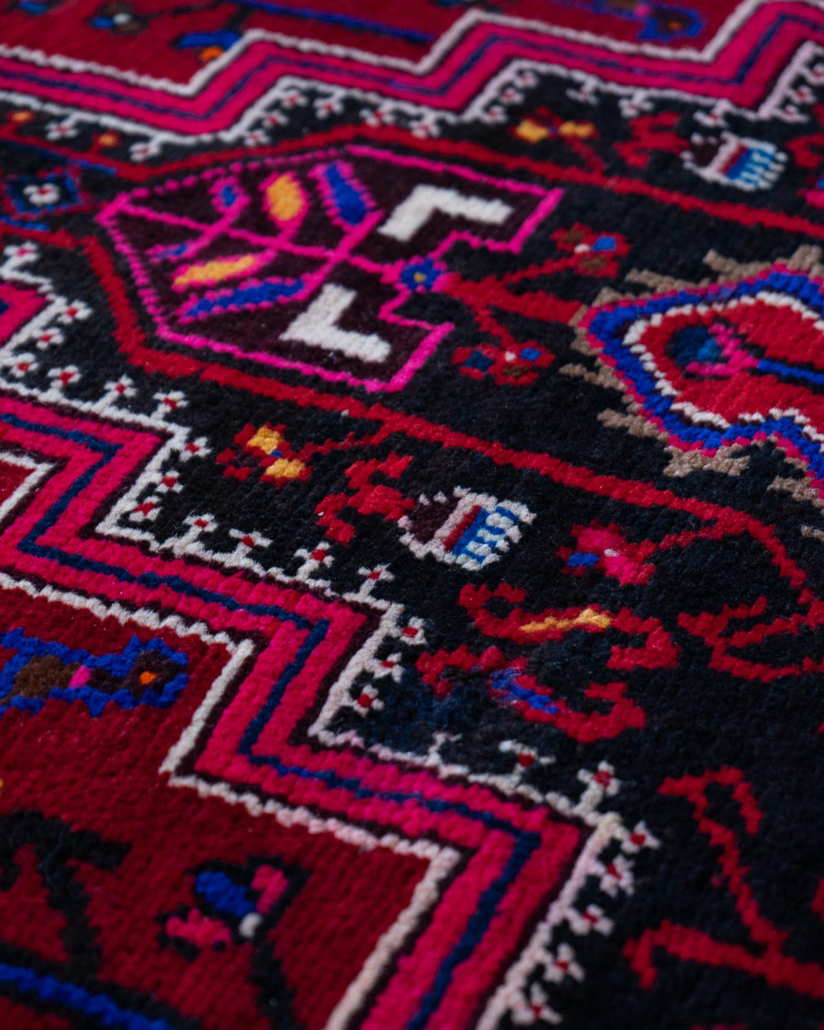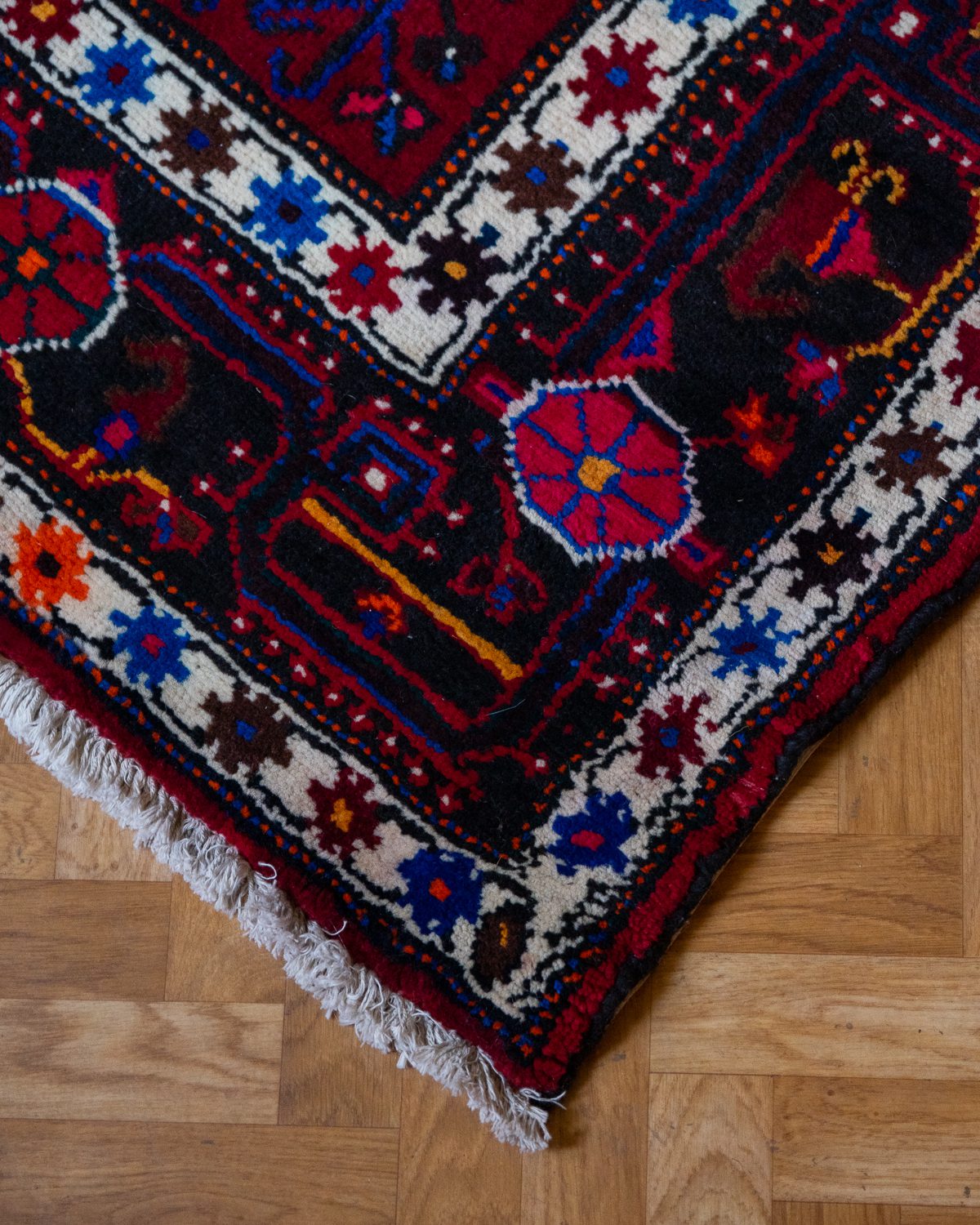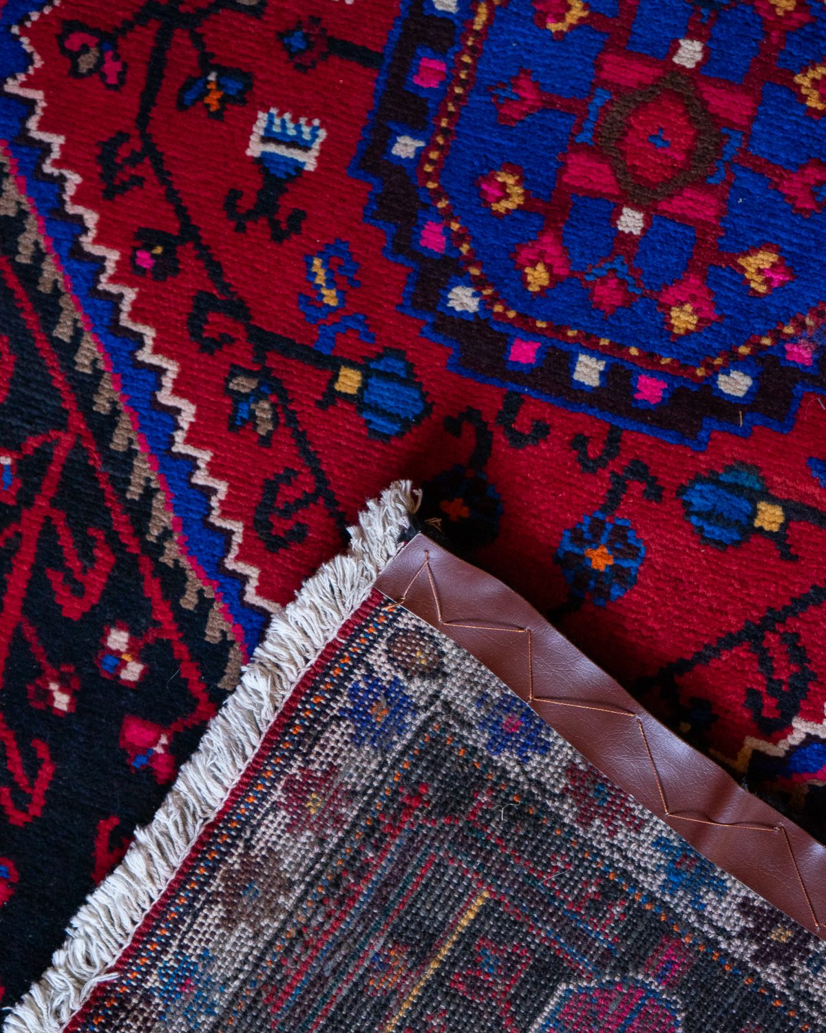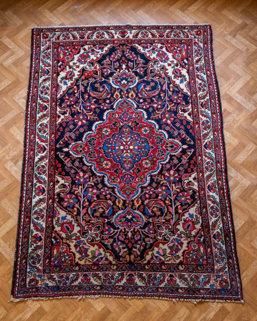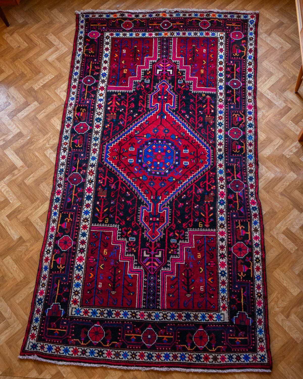 Pärsia Tuyserkani käsitöövaip. Väga tugevate värvidega, erksate indigo detailidega. Heas korras, vaiba all äärtes on tugevduseks nahast ribad.