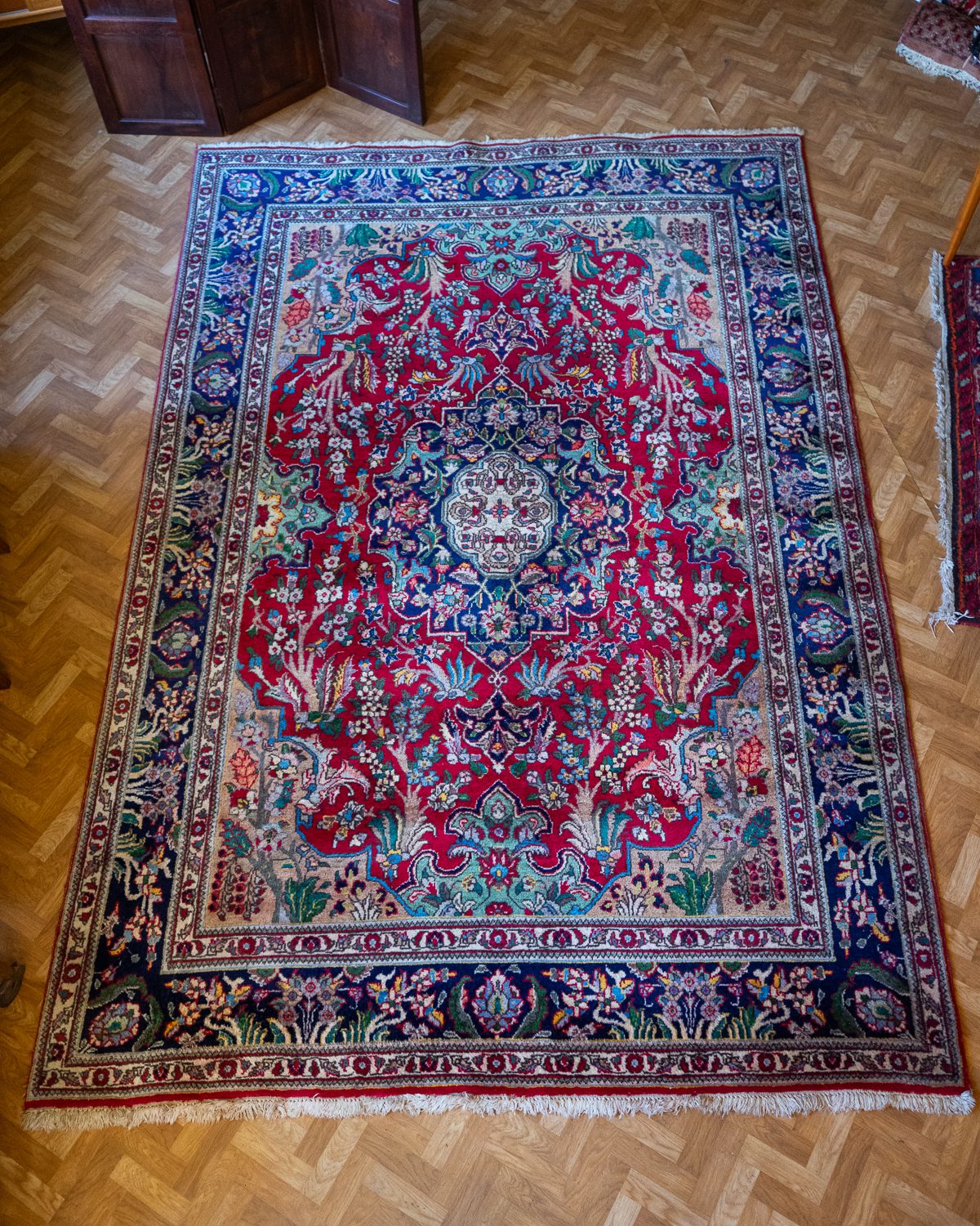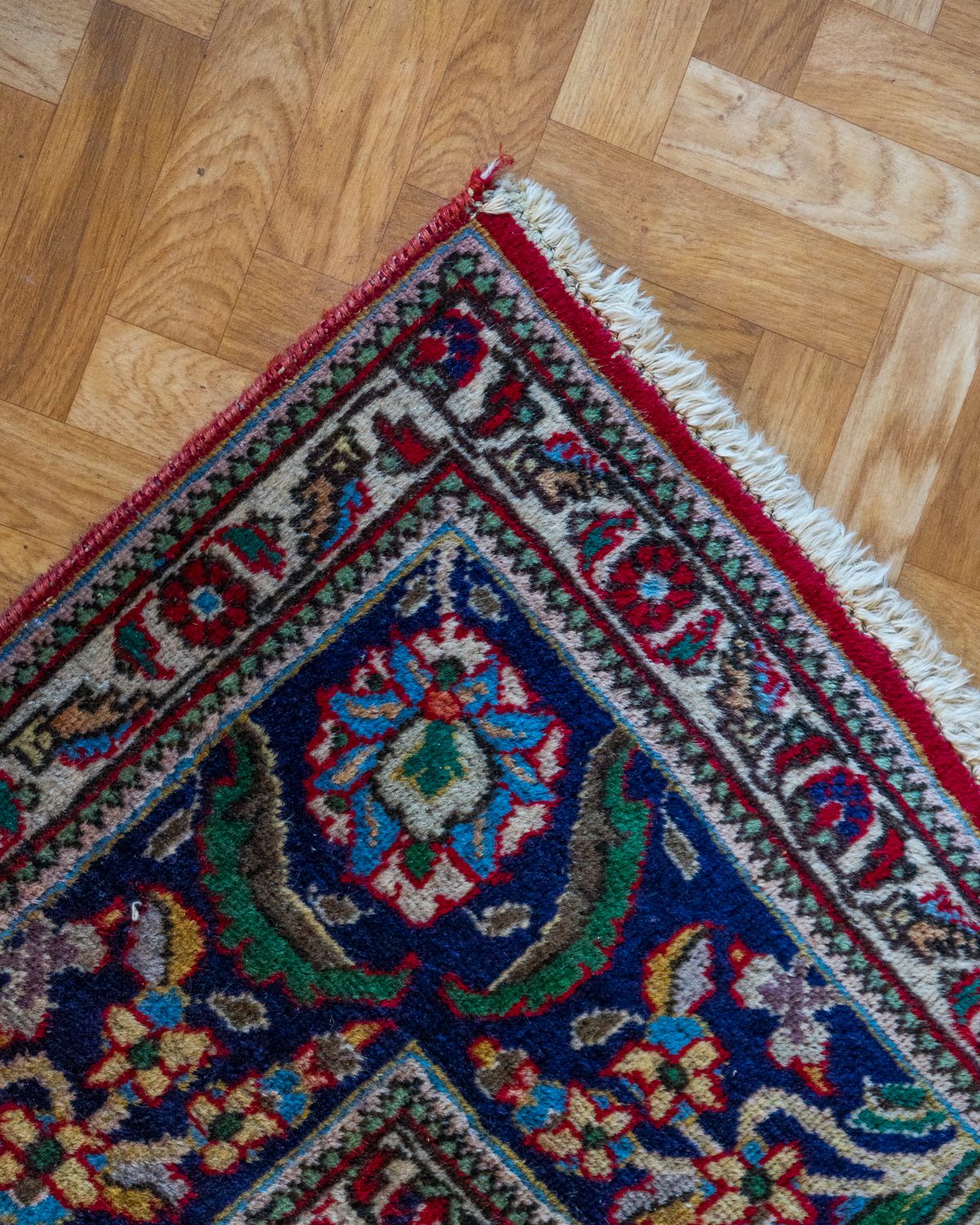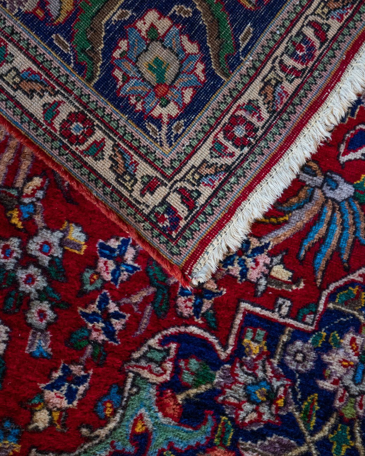 Tiheda mustriga kirju Pärsia Kashani vaip. Erksate värvidega, mustris palju erinevaid lilli ja linde. Heas vintage seisukorras, esineb loomulikku kulumist. Pesumajas märgpuhastatud.