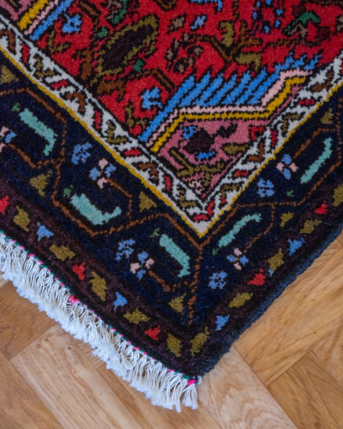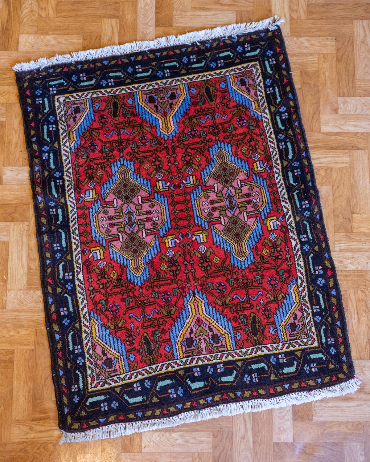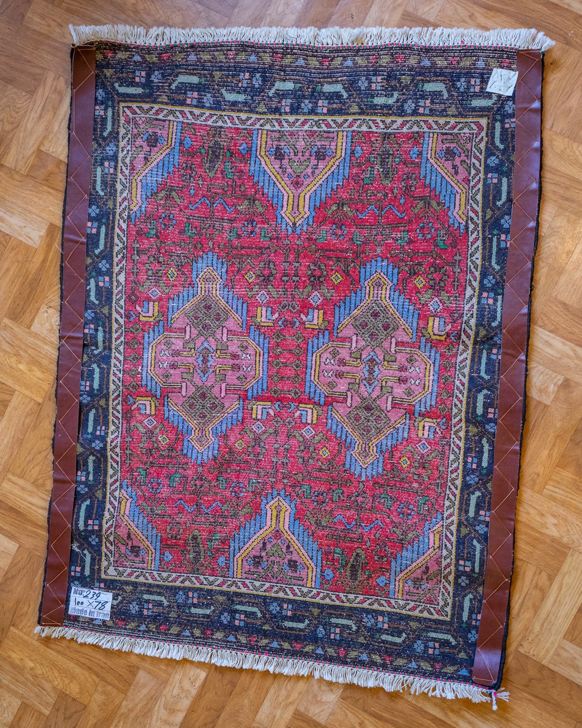 Väga hästi säilinud väike Pärsia villane käsitöövaip. Alumisel küljel on tugevduseks nahast ribad kuid ääred hoiavad veidi laineliselt.