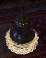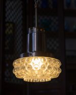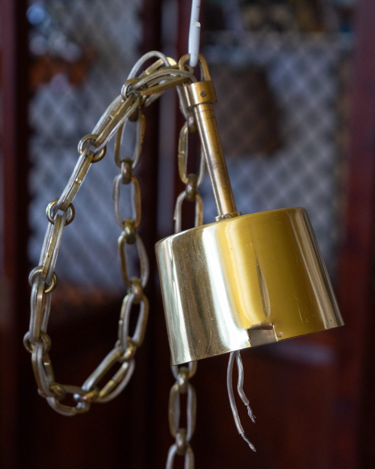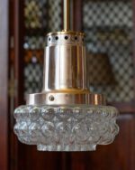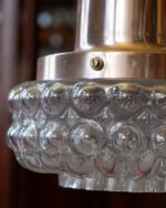 1970ndatel Saksamaal Limburgi tehases valminud kergelt roosaka messingu tooni laelamp, mille on disaininud Soome klaasikunsti pioneer Helena Tynell. Ta oli tuntud oma innovaatiliste tehnikate poolest ning Limburgi tehasele loodud “mullitehnika” (bubble technique) on tema kõige kuulsam ja hinnatum seeria. Valgusti ketti on võimalik soovi korral lühemaks reguleerida. Heas vintage seisukorras! Laeroseti sisse on mööda lage jooksva juhtme jaoks auk lõigatud.