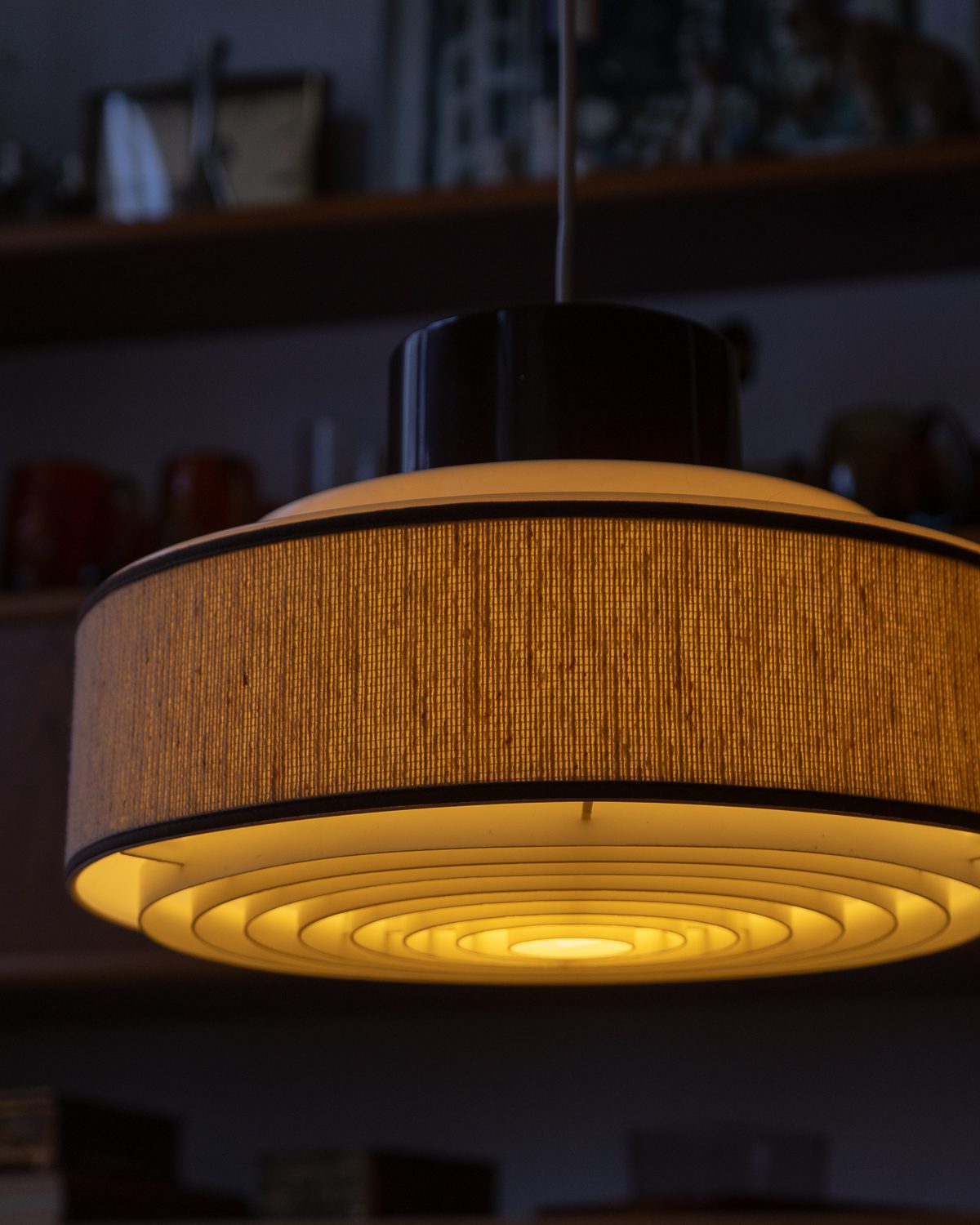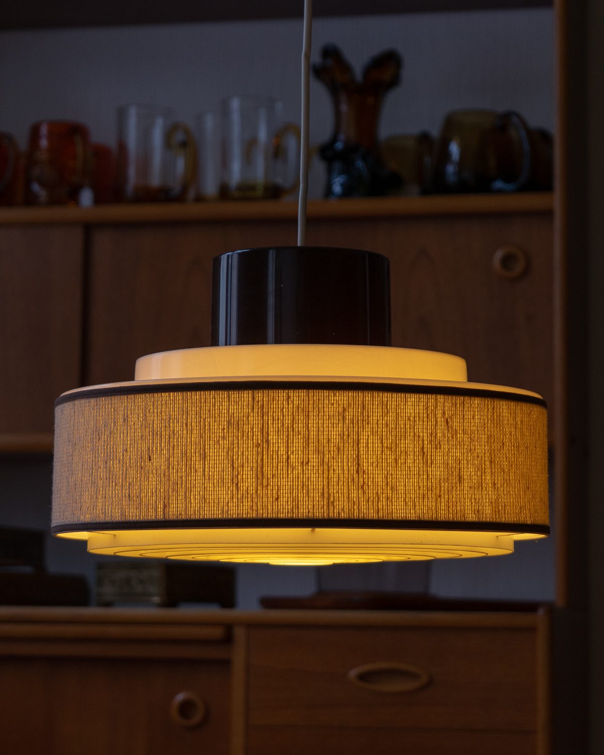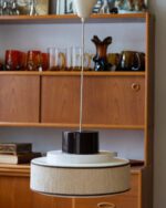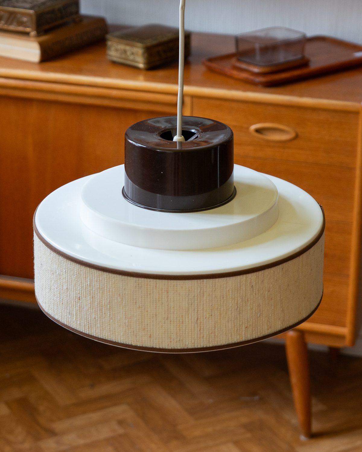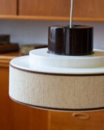 1970ndatel Skandinaavia päritolu valge ja pruuni plastikuga laelamp, millel on tekstiilist osa. Tekstiil hajutab valgust pehmelt ja loob õdusa miljöö. Heas vintage seisukorras!
