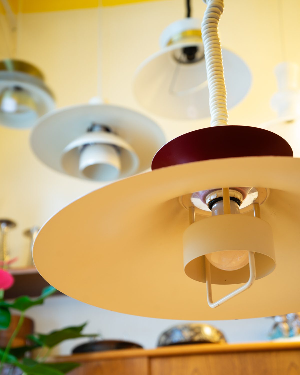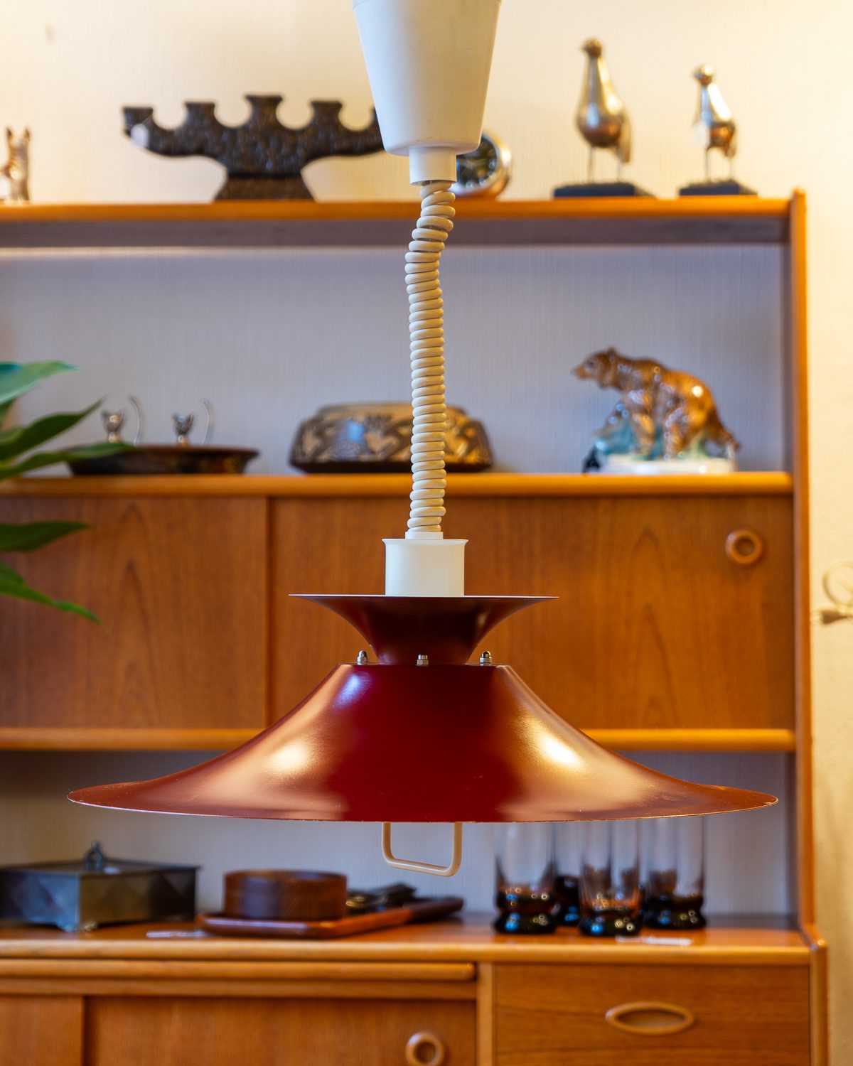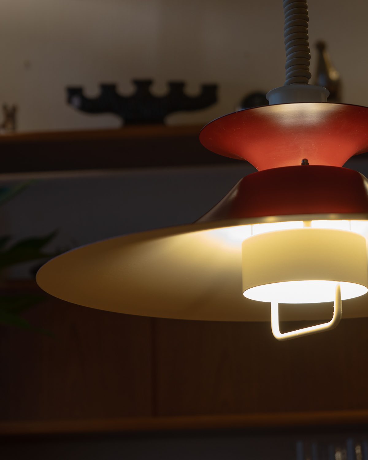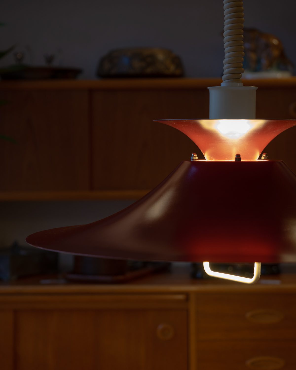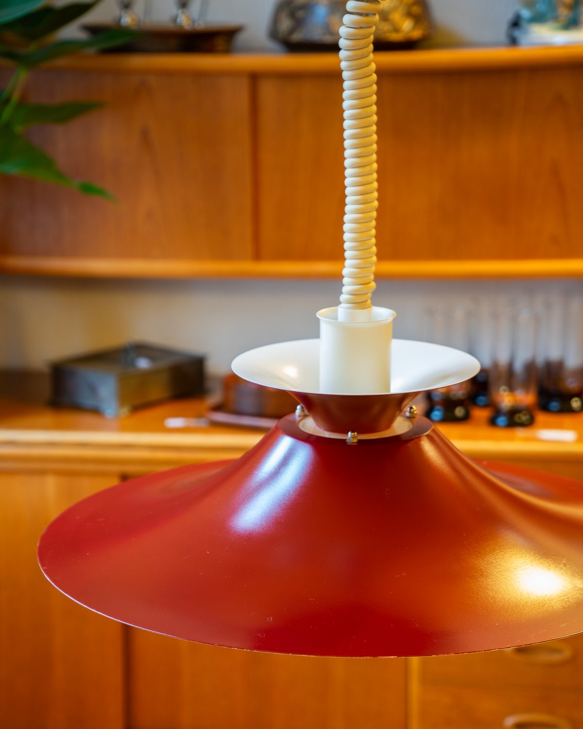 Eelmise sajandi keskpaiga skandinaavia päritolu reguleeritava kõrgusega metallist laelamp. Reguleerimine töötab hästi, kuplile on tehtud mõned värviparandused.