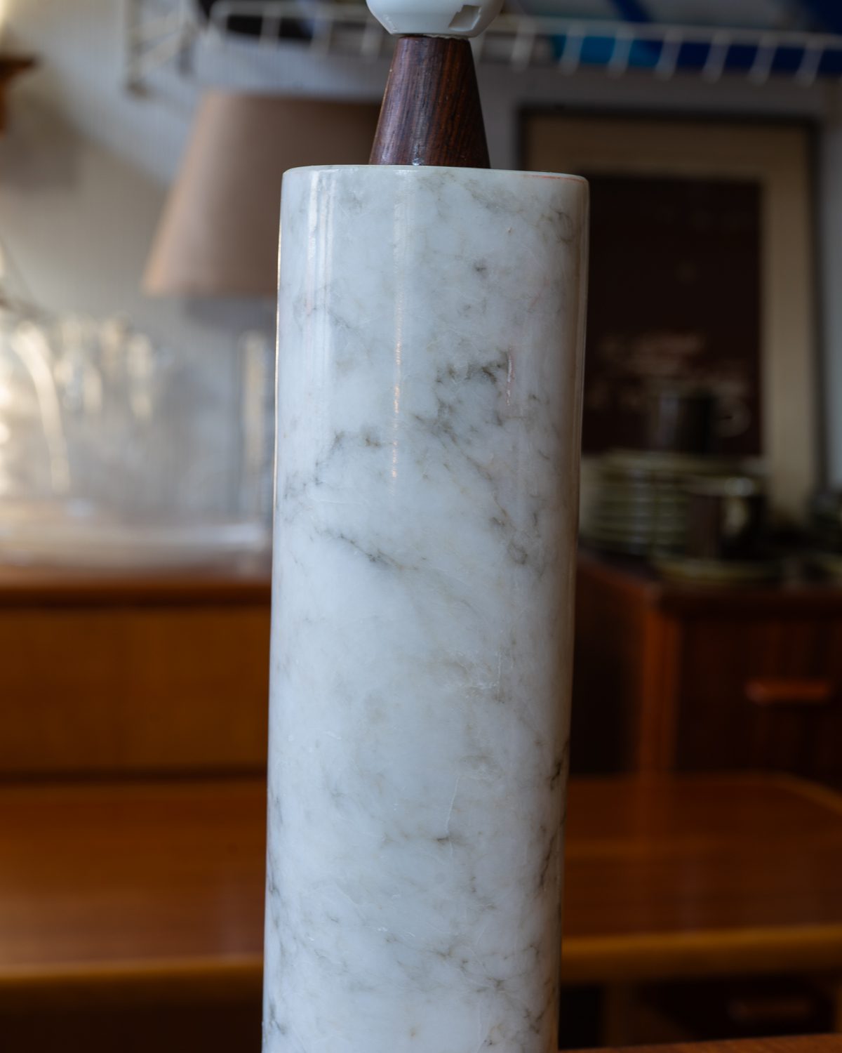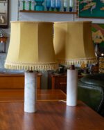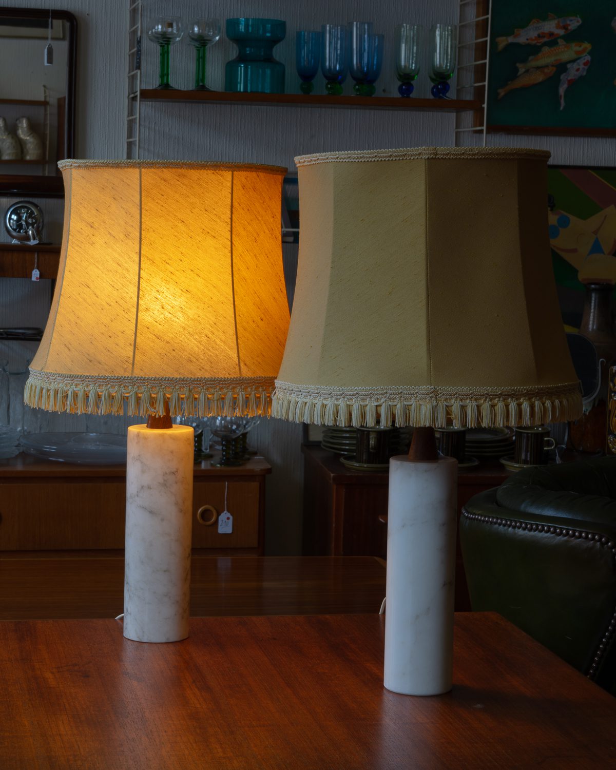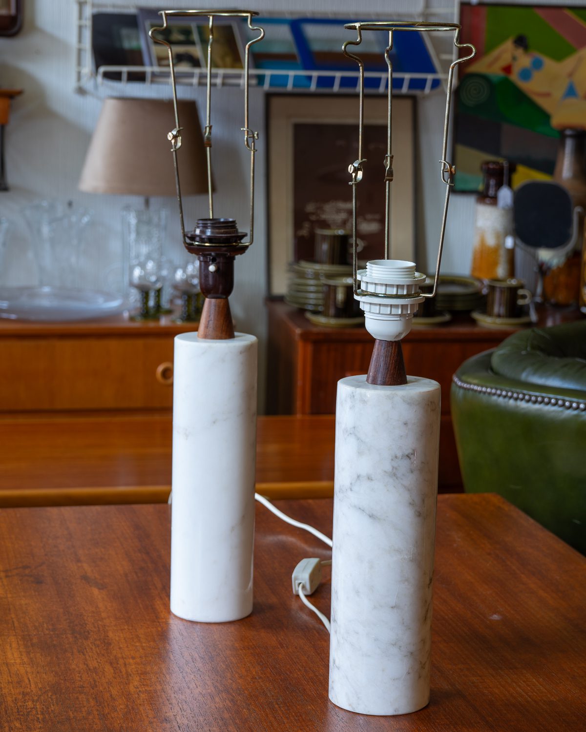 Itaaliast pärit raske marmorist jalaga ja tiigipuust detailidega laualampide paar. Ühel lambil on sokkel vahetatud tänapäevase vastu, teisel on säilinud originaalne sokkel. Lambid on heas korras ja toimivad. Kuplid pole originaalsed, neid on võimalik vahetada teiste vastu. Suure huvi korral võime müüa ka ühe lambi eraldi, kuid eelistame müüa paarina.