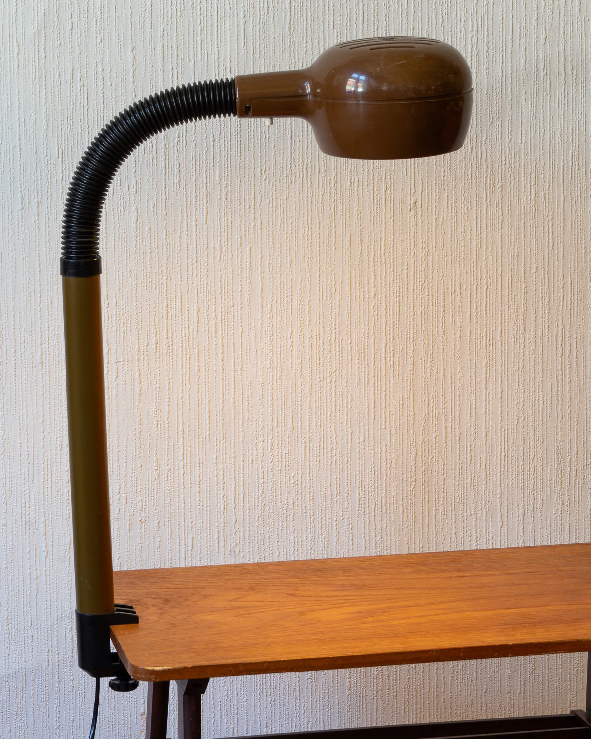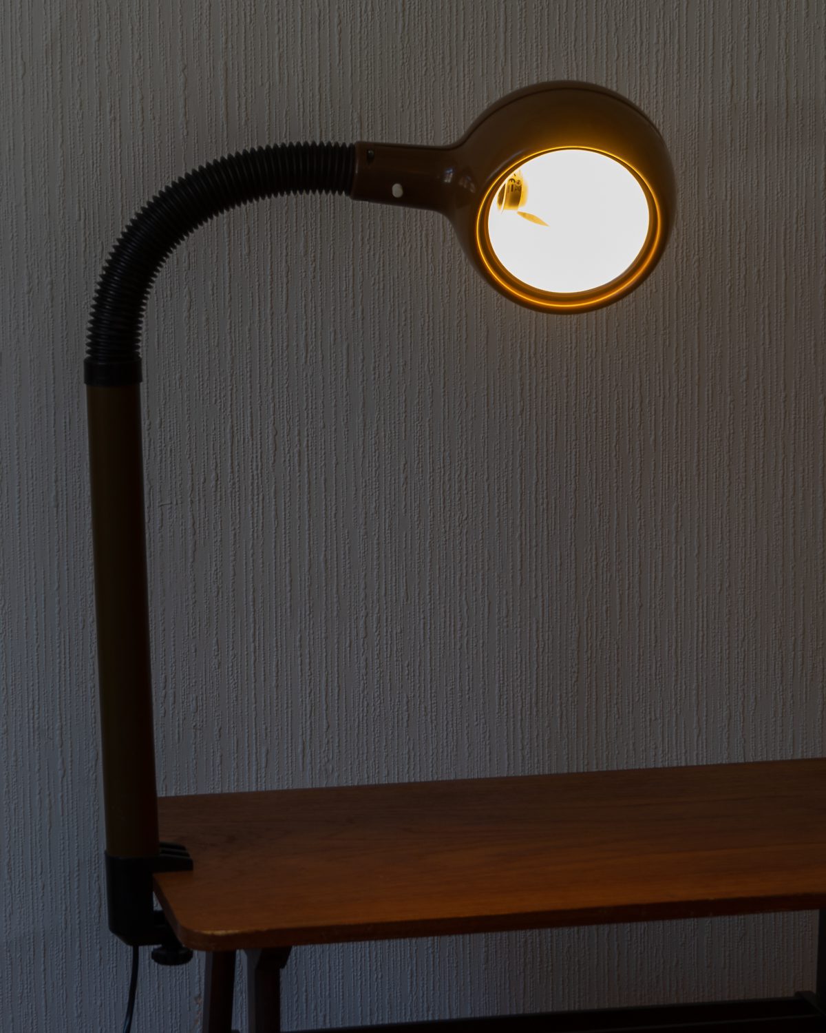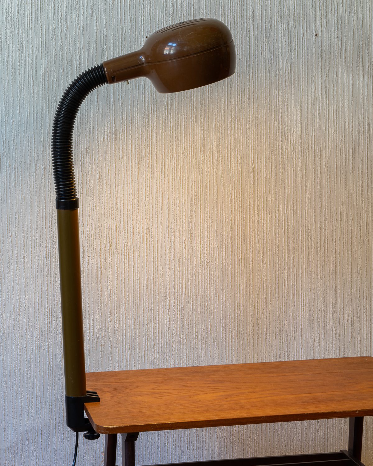1970ndatel Rootsi valgustitootja Fagerhultsi auhinnalisest “Cobra” valgustiseeriast pärit klambrikinnitusega laualamp. Lambi suund on 360° ulatuses reguleeritav. Lamp on heas vintage seisukorras, esineb vanusele omast kulumist, kriime ja värvikahjustusi.