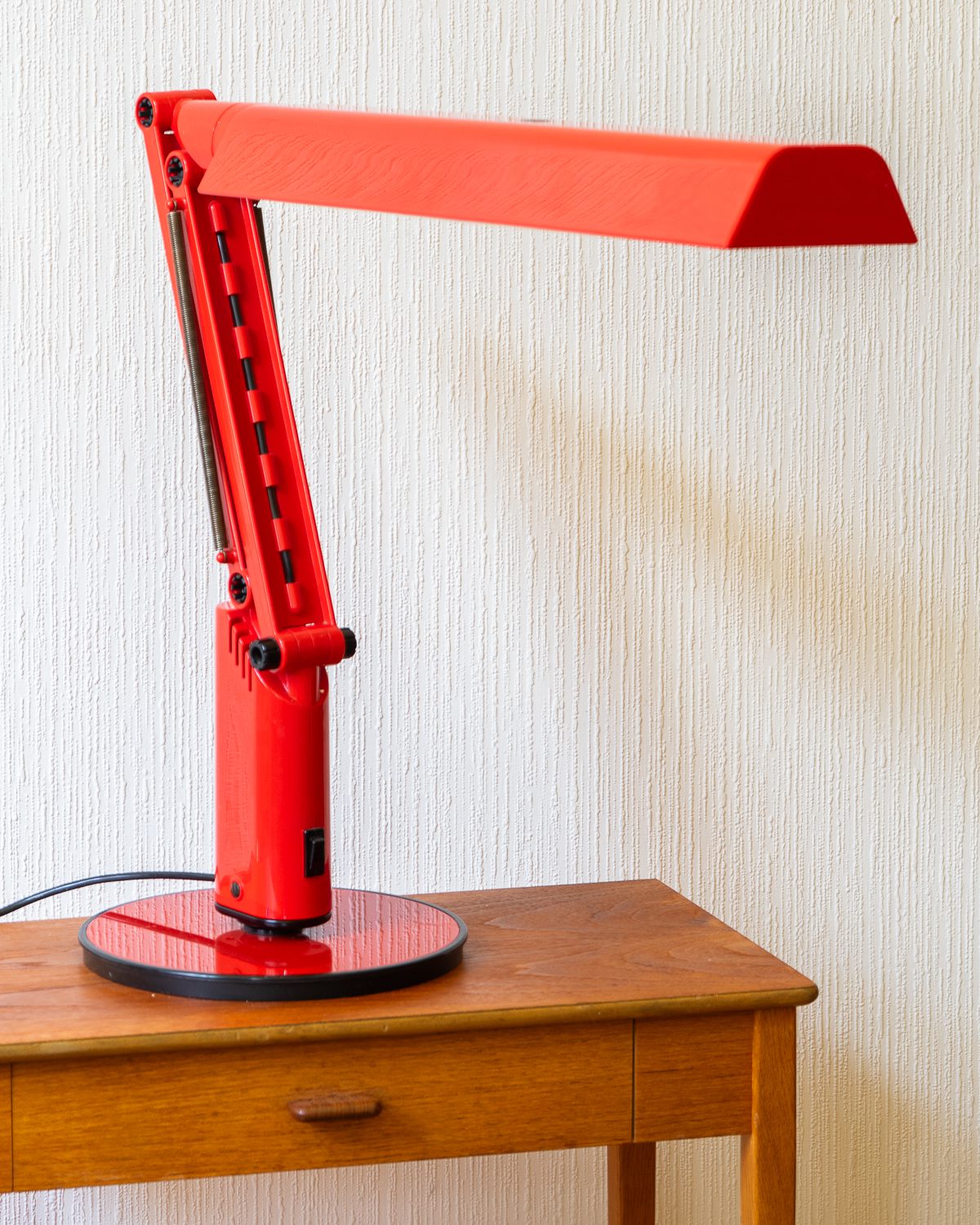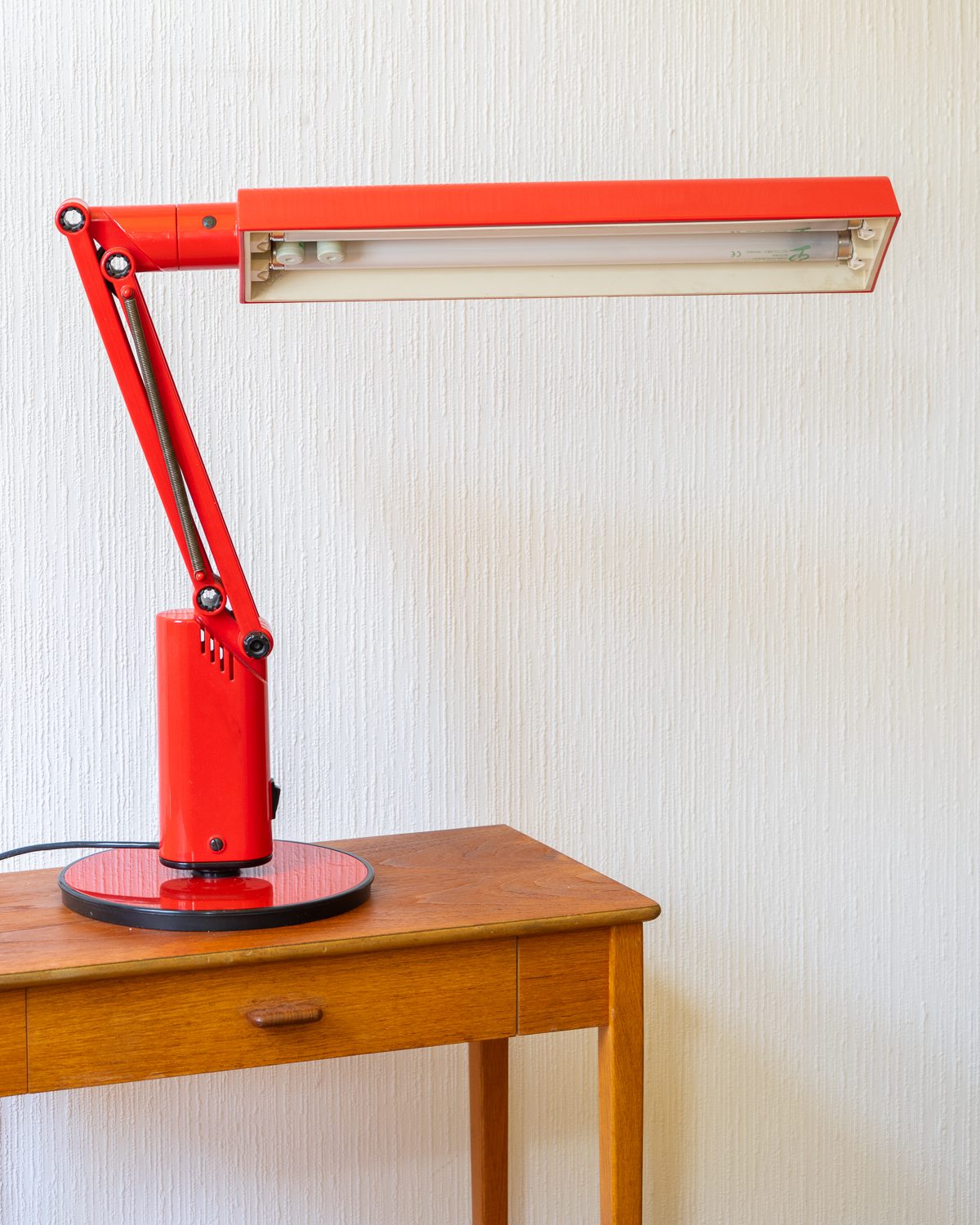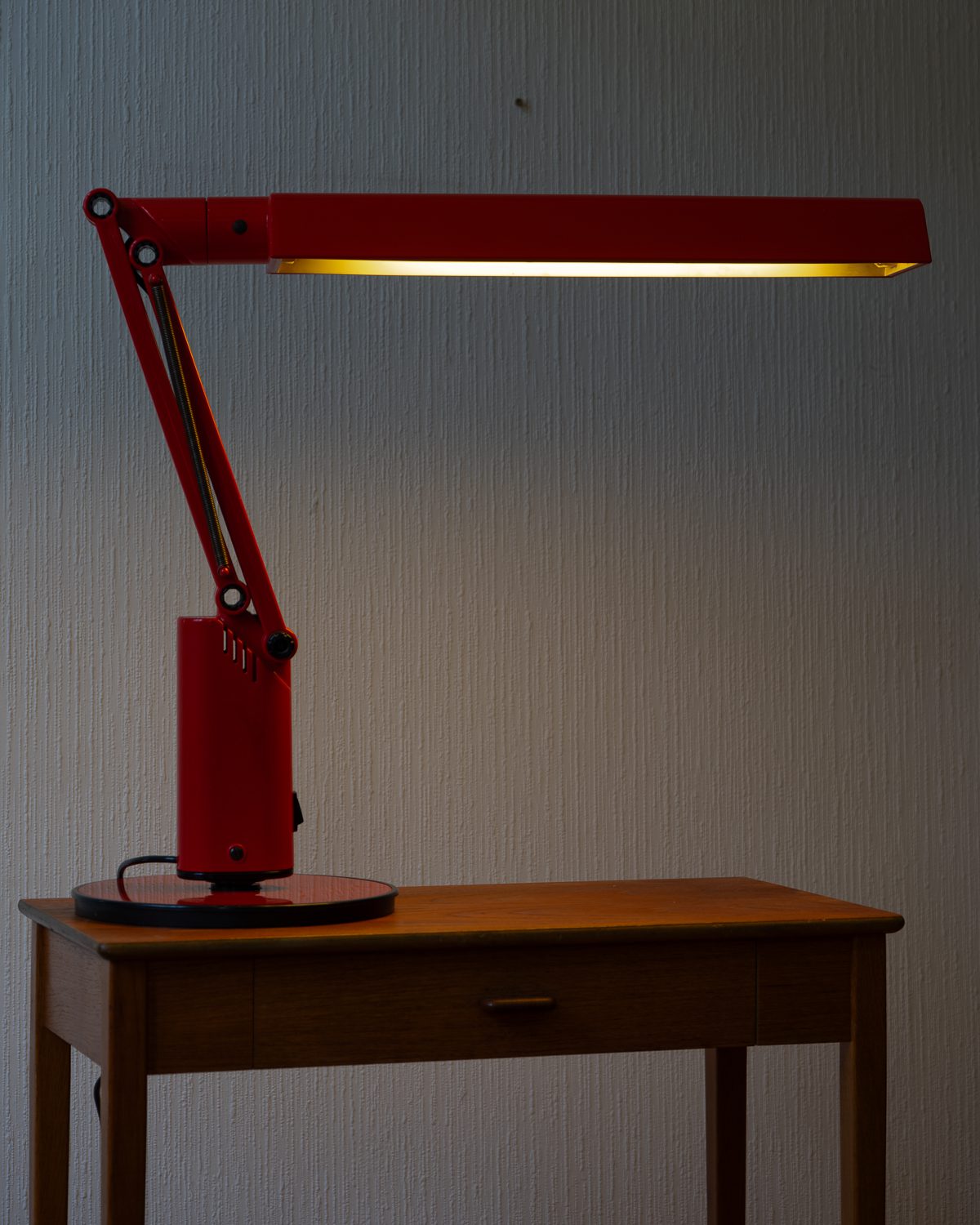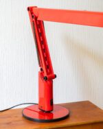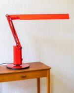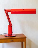 Tom Ahlstromi ja Hans Ehrichi disainitud punasest plastmassist Luciferi-nimeline space age laualamp. Valmistatud Rootsi valgustitootja Fagherhultsi poolt 1970ndatel. Lambi pinnal esineb vanusele omaseid kriipse-kraapse. Elektrisüsteem on kontrollitud ning lamp on valmis sinu koju valgust ja värvi tooma.