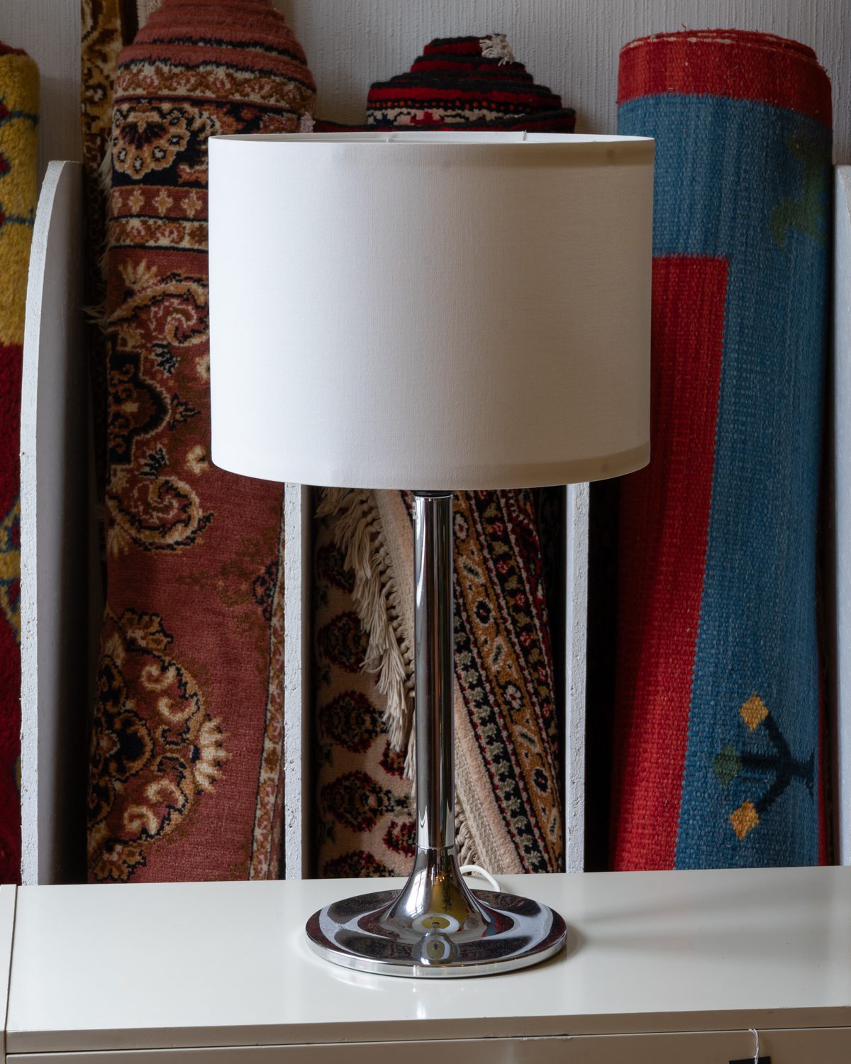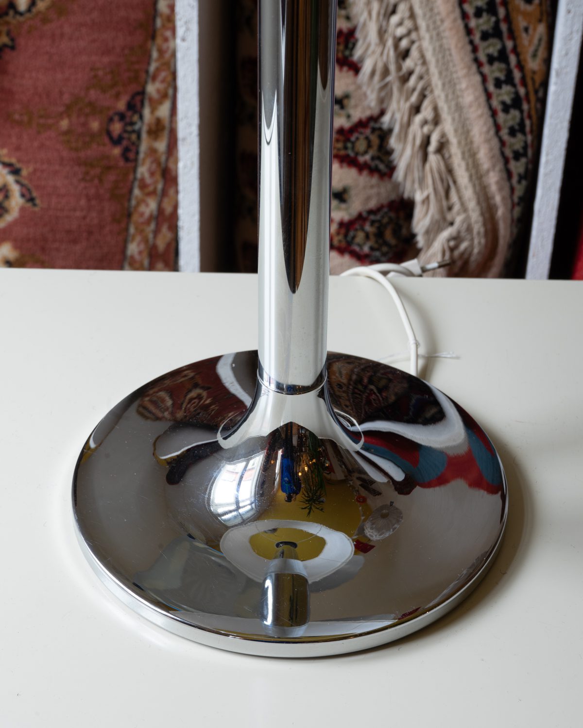 Kroomitud jalaga laualamp tootjalt Ivars, Rootsi eelmise sajandi teiselt poolelt. Lambil uus Ikea kuppel. Juhtmed vahetatud.
