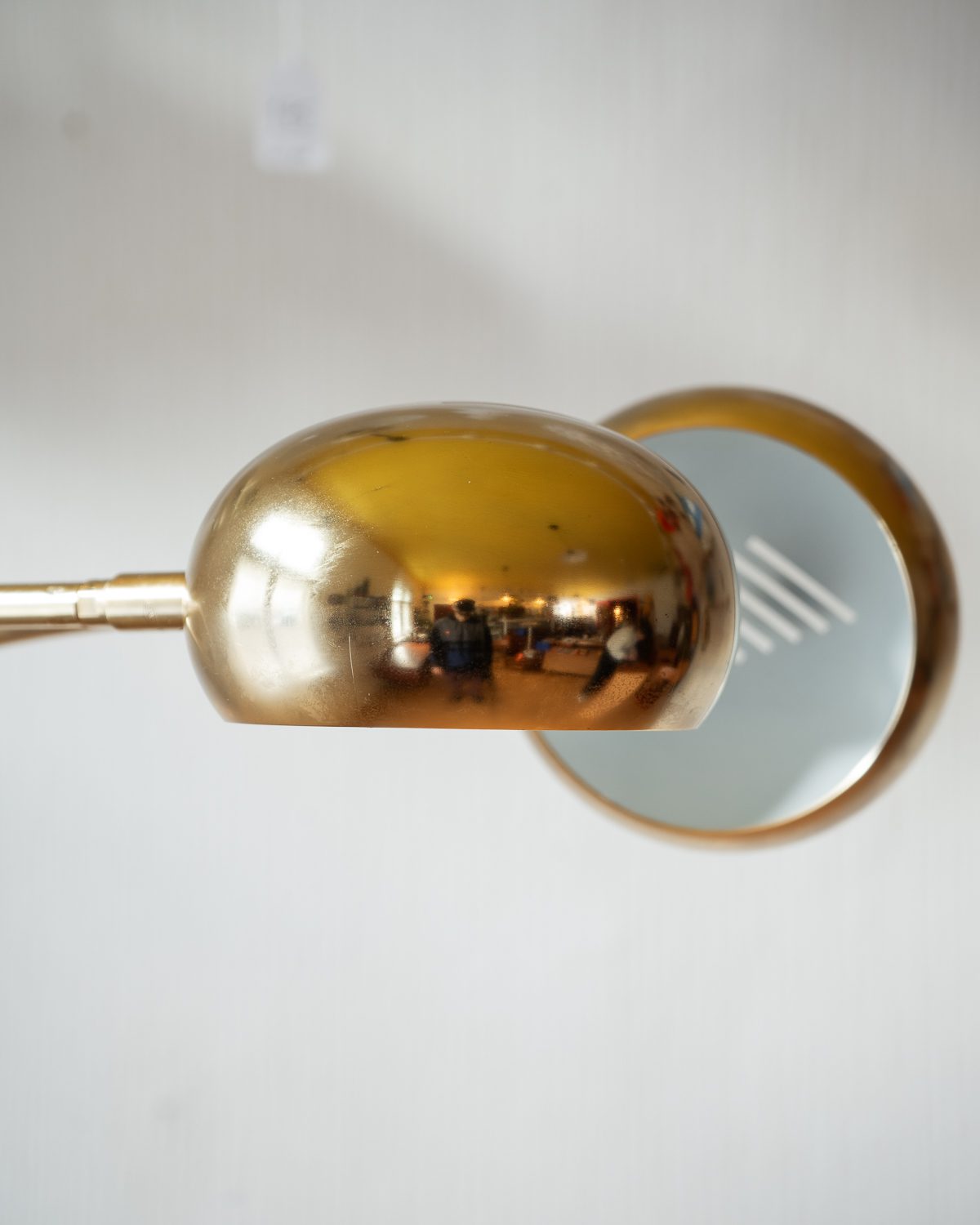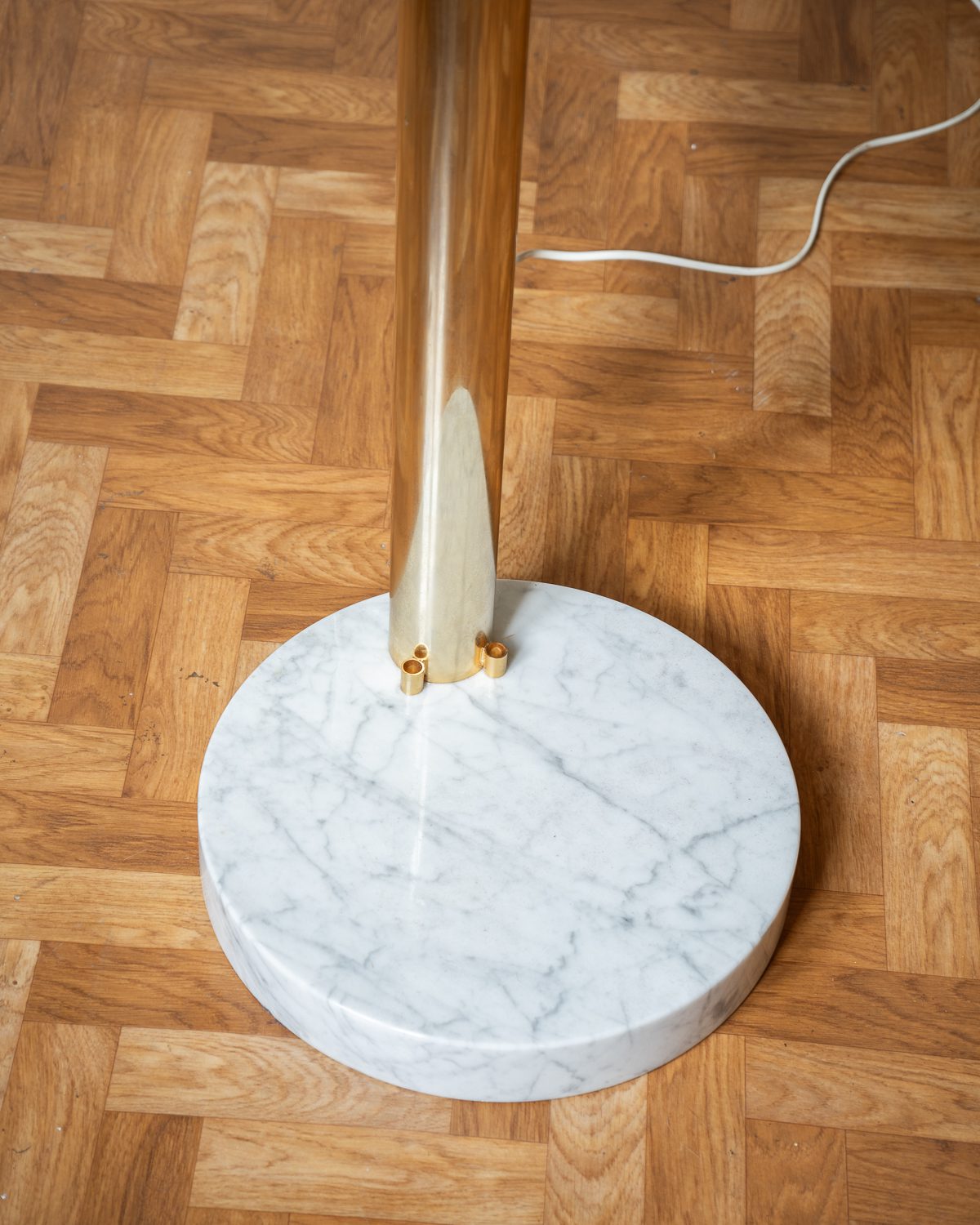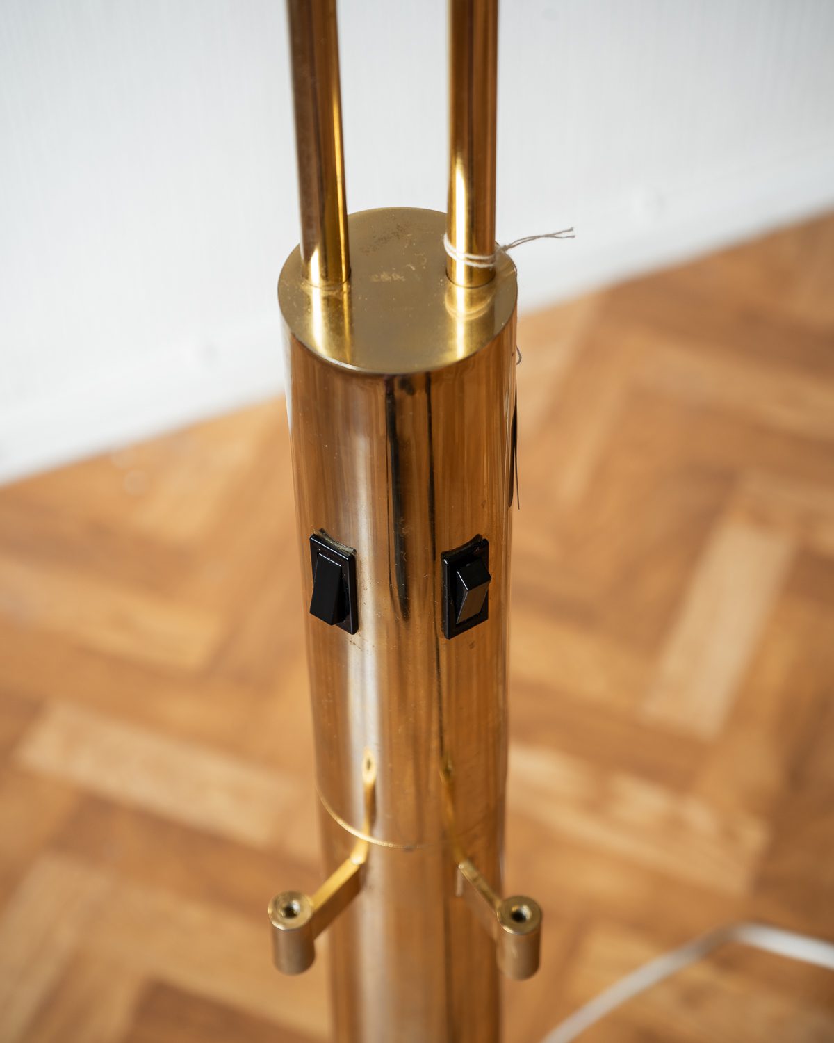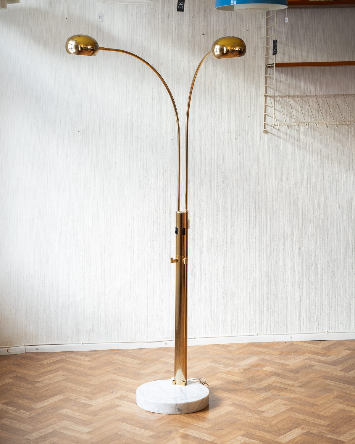 Kahe haruline messingu tooni põrandalamp kivist alusplaadiga. Harusid ja kupleid võimalik pöörata.